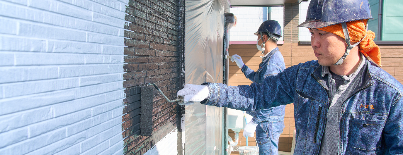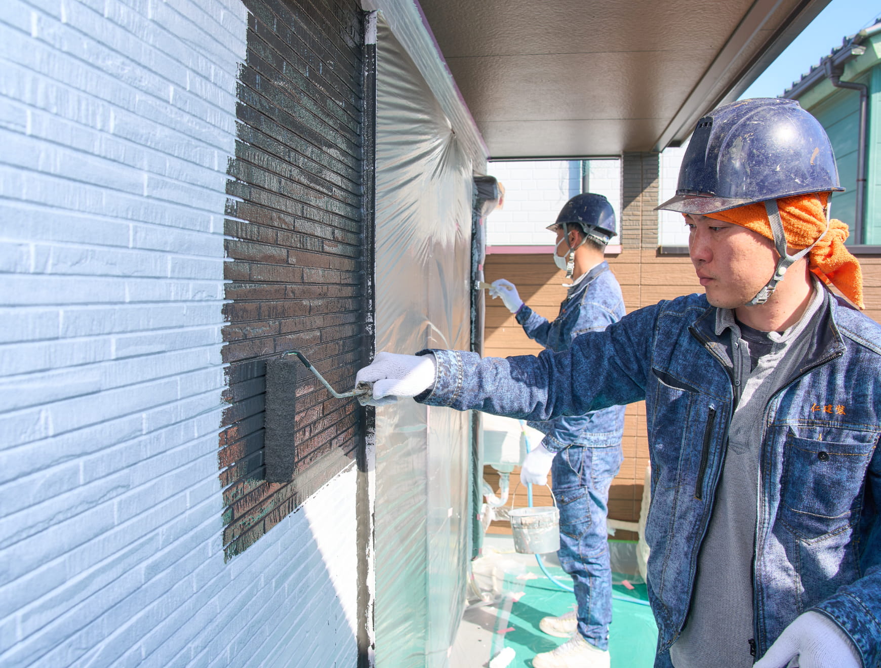 耐久性の向上とより美しい仕上がりのためにまずは下塗りを行います。下塗りは密着度の高い塗料や厚みが出る塗料を使用し、土台を作っていくようなイメージです。次に中塗りを行います。通常は仕上げで使用する塗料と同じものを使いますので、中塗りが終わった段階では、工事完了後のイメージにぐっと近づきます。そして、最後の仕上げが上塗りです。中塗りと同じ塗料で、より丁寧に塗布してキレイに仕上げていきます。