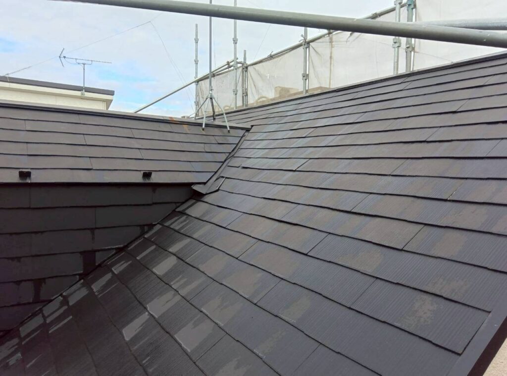 屋根部分では、コロニアルスレートのクラック補修を行い、タスペーサーを設置して縁切り対策も実施しました。
