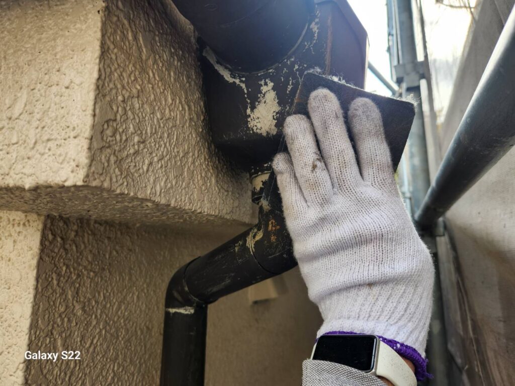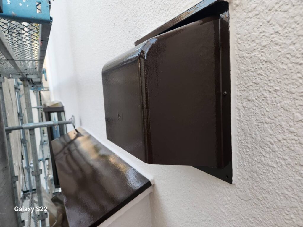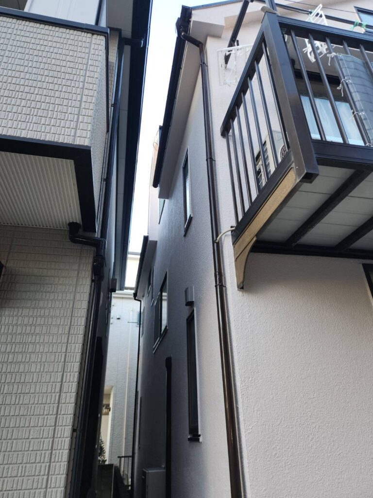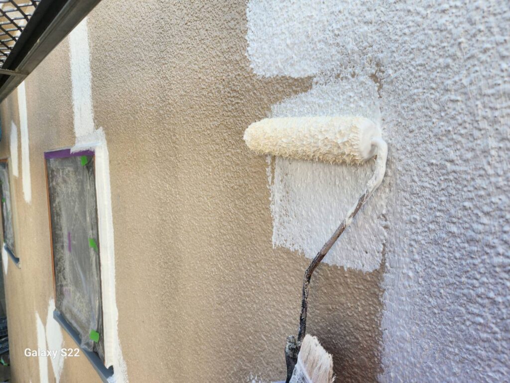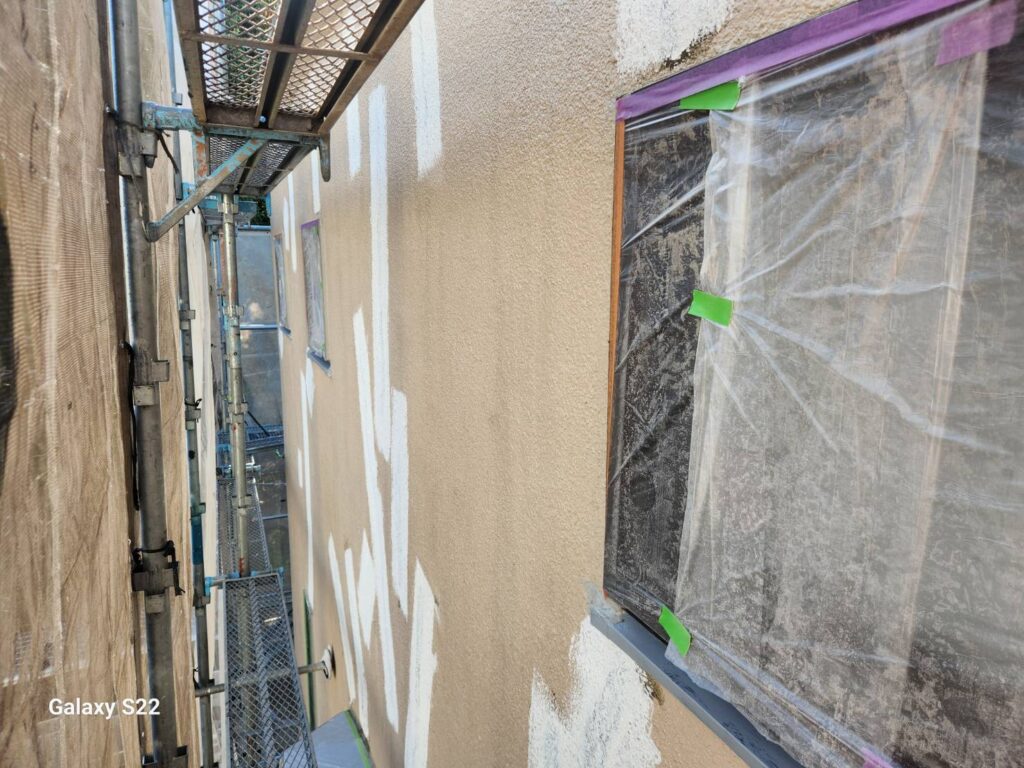 外壁については、水性カチオンシーラーによる下塗り後、水谷ペイントのリフレッシュフィラーで平滑に整え、ナノウォール15(3分艶・SS-08)にて中塗り・上塗りを実施しました。