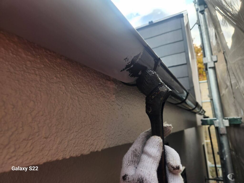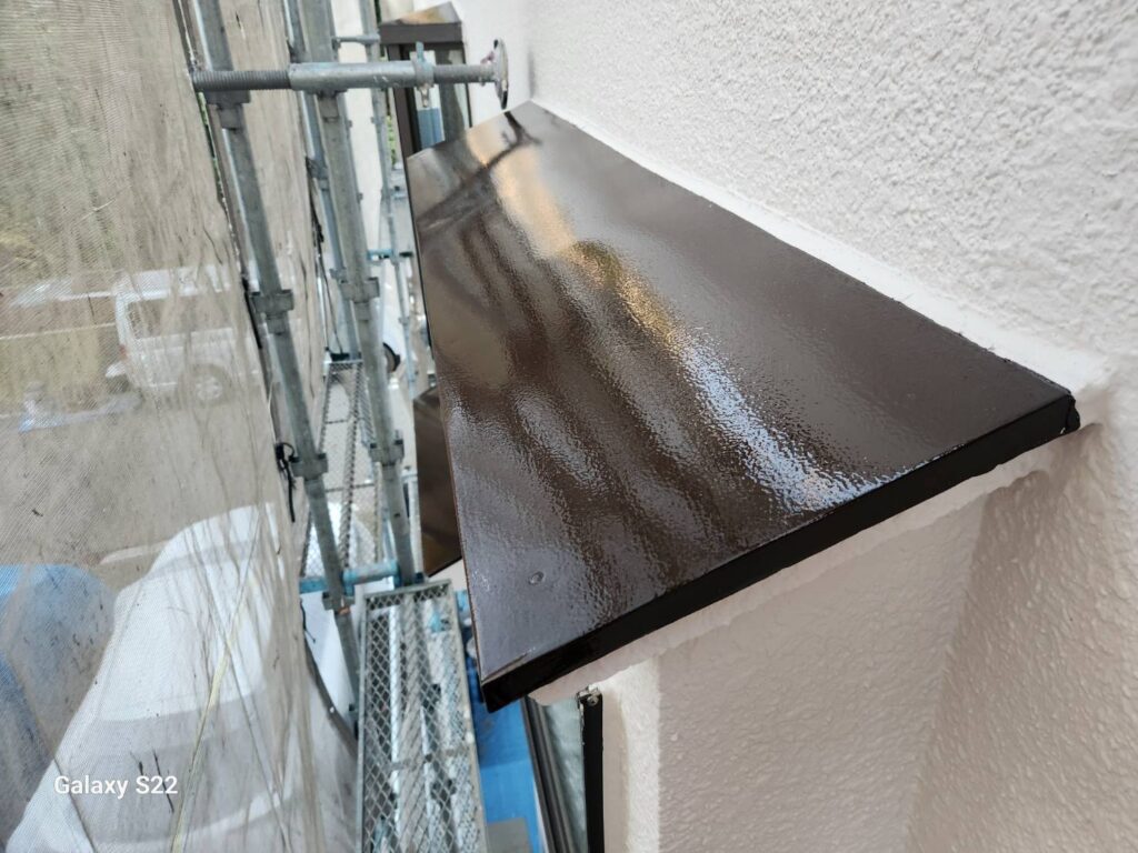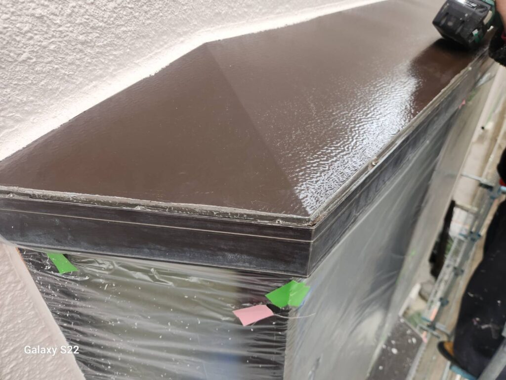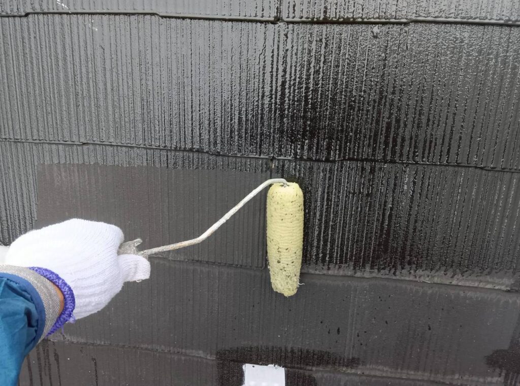 その上で、エポックマイルドシーラーによる下塗り、ハイパーサーフによる2回目の下塗りを行い、仕上げにナノルーフ15(アッシュブラック)を2回塗り重ねることで、合計4回塗りの高耐久仕様で仕上げています。